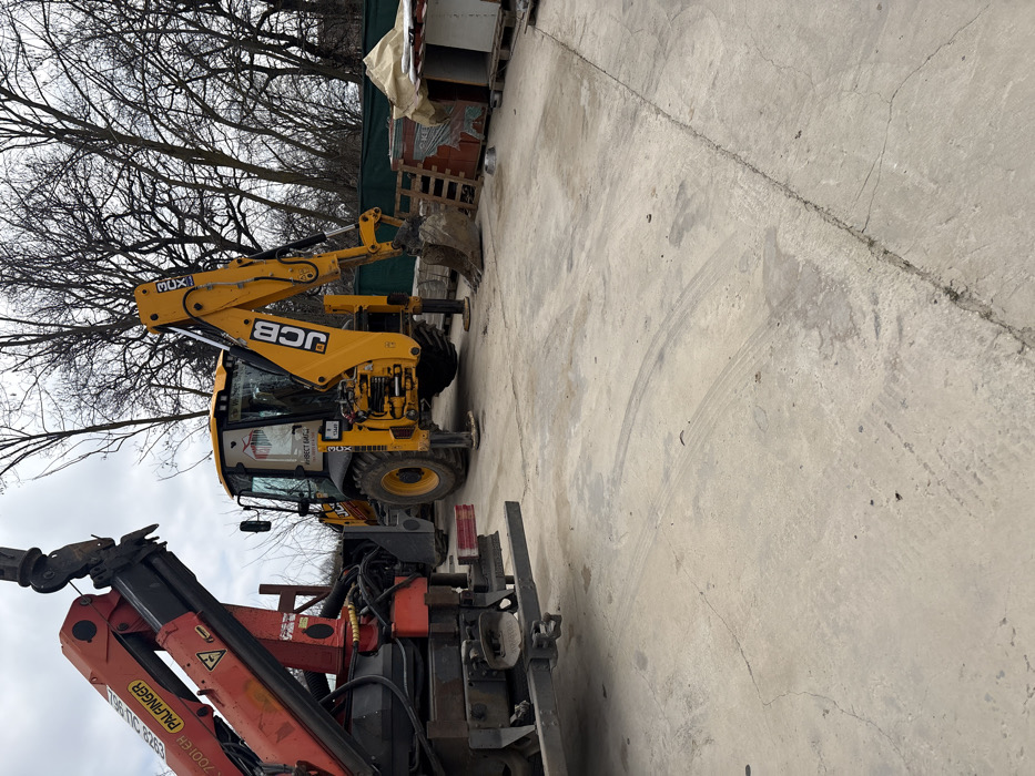 The image depicts an outdoor concrete lot in Bliznatsi, Bulgaria, under an overcast sky. In the left foreground, a red and black Palfinger PK 7001 EH crane attachment, mounted on a heavy vehicle, is partially visible, with its boom extended upwards and a hook at its end. To the right, a yellow JCB 3CX backhoe loader is positioned with its stabilizers deployed, indicating a stationary state. Both the front loader bucket and the rear excavator bucket are resting on the ground. The JCB's cab features a decal with "ИНВЕСТ ВИШИ" and a barcode-like graphic. The ground is a light grey concrete slab, showing cracks and distinct tire tracks from heavy machinery. In the background, behind the equipment, stacks of construction materials, including bricks or paving stones on wooden pallets, some covered with tarpaulins, are visible alongside a green fence. A dense cluster of bare deciduous trees extends across the upper background. No individuals are present in the scene.