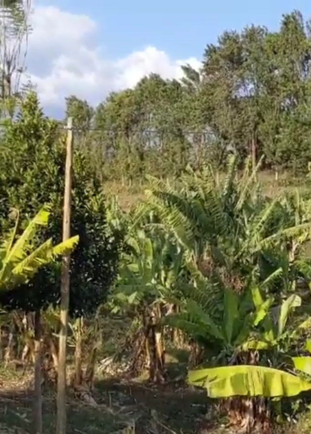 banana plantation with a gray building in the background. The sky is blue with scattered clouds. A road runs alongside the plantation, with a few vehicles driving on it. The environment is lush with greenery and trees. The camera slowly pans to reveal more of the road and building. The light is bright, suggesting daytime.