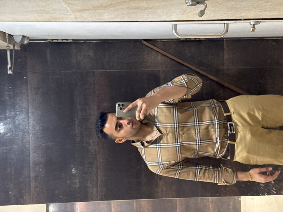 The image depicts a male individual taking a mirror selfie in an indoor setting within New Town, India. The man, with short dark curly hair, is positioned centrally, looking directly into the camera. He wears a light brown plaid long-sleeved shirt with the sleeves rolled up, khaki trousers, a dark brown belt with a silver buckle, and a gold-colored chain around his neck. A yellow bracelet is visible on his left wrist. He holds a light-colored smartphone with a distinctive camera module in his right hand, positioned at chest level to capture the reflection. The background, reflected in the mirror, features a dark, vertically textured wall on the left and a lighter, possibly beige, door or wall panel on the right. A silver-colored door handle and a small hook are visible on the door panel, along with a door closer mechanism mounted above it. A dark, diagonal support structure or object leans against the lighter wall segment behind the man's right side.