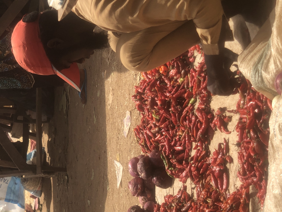 The scene depicts an outdoor market stall in Akwanga, Nigeria