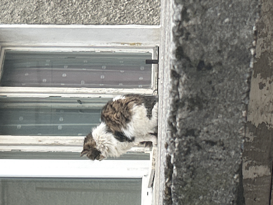 - "A long-haired cat with a white chest, belly, and facial markings, along with patches of dark brown and lighter brown fur on its back, sides, and head, sits on a weathered, coarse grey concrete windowsill" by FM-51spx1, licensed under CC BY 4.0