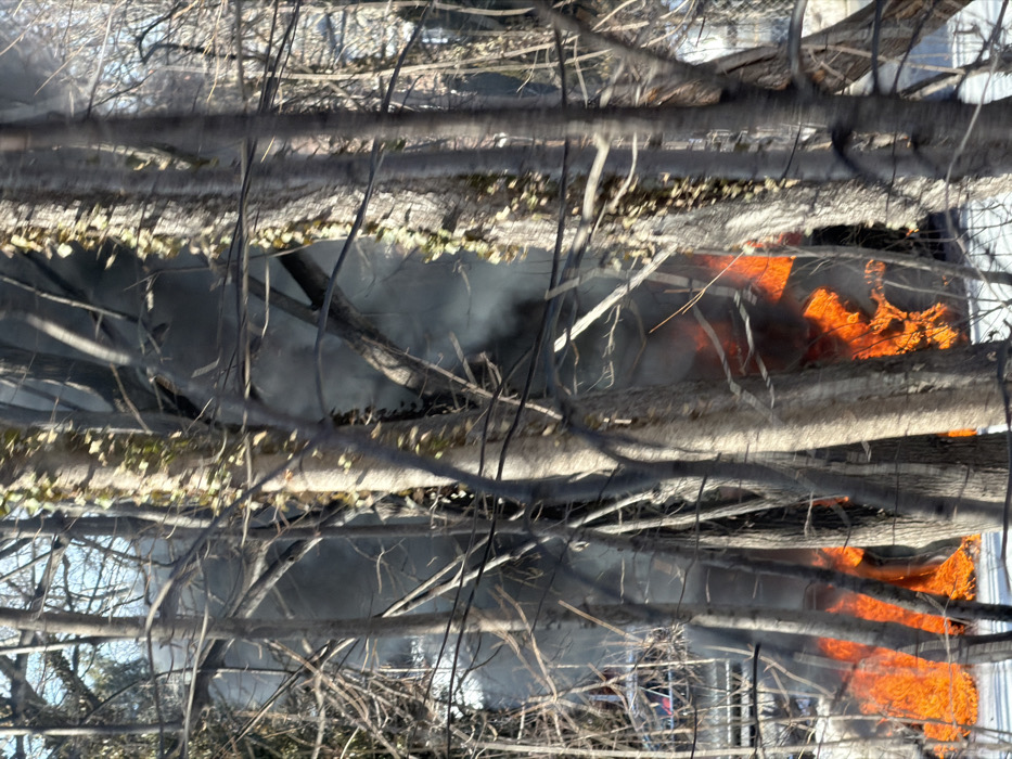 A building obscured by trees is on fire. Flames erupt from a window. Thick grey smoke billows. Branches of trees cover most of the image. The building appears to be white and grey. More trees can be seen above. The perspective suggests the photo was taken from the ground looking upward.