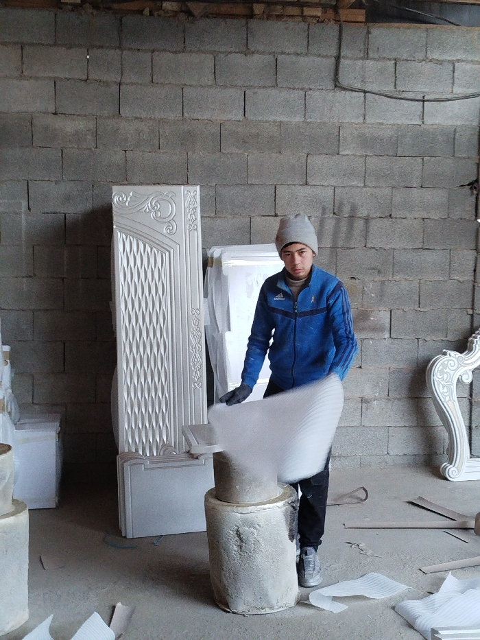 The scene depicts an indoor workshop or storage area, located in Andijan, Uzbekistan, characterized by unpainted grey cinder block walls and a concrete floor. A single male individual, appearing young and of Central Asian ethnicity, is positioned center-right. He is dressed in a light grey knit beanie, a blue zippered jacket with white stripes on the sleeves (suggesting an Adidas brand), dark pants, dark gloves, and grey sneakers. The individual is actively manipulating a large, white sheet of textured foam packaging material, which exhibits motion blur as it is held over a light-colored, two-tiered cylindrical object that serves as a stand or base. His gaze is directed forward, toward the camera. In the background, to the left, stands a tall, upright, white decorative panel with intricate carved or molded patterns, including scrollwork and a geometric lattice design. Behind the central figure, a larger white object, possibly wrapped, is partially visible. To the far right, a curvilinear, ornate white furniture component is partially visible. The concrete floor surrounding the central figure has scattered pieces of similar white foam packaging material. A thin wooden beam is present along the top edge of the cinder block wall, and some dark electrical wiring runs horizontally across the upper right section of the wall.