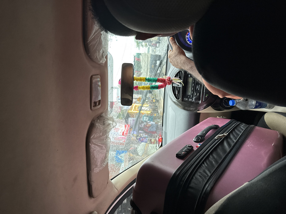 The image depicts an interior view from a passenger vehicle, looking forward through a rain-streaked windshield at a street scene in Dikwella, Sri Lanka. A male driver, visible from the back, is seated in the driver's seat, with his right hand gripping the steering wheel. The front passenger seat is occupied by a large, pink hardshell suitcase, which has a black trim, zippers, and a "TRIPP" brand combination lock; a black soft-sided bag rests on top of it. The suitcase is partially secured by a visible seatbelt. The vehicle's interior features a dashboard with a central infotainment system. A multi-colored garland, primarily yellow, green, and red, hangs from the rearview mirror. Both front sun visors are observed to be covered in clear plastic wrapping. A clear plastic water bottle with a blue cap is positioned in a cup holder near the central console. Outside the vehicle, the environment is a busy urban street with other vehicles, including a truck, and indistinct figures of pedestrians. Buildings lining the street are adorned with strings of yellow lights. The wet appearance of the windshield and the street indicates recent or ongoing rainfall. Utility poles and a distant blue sign are also visible.