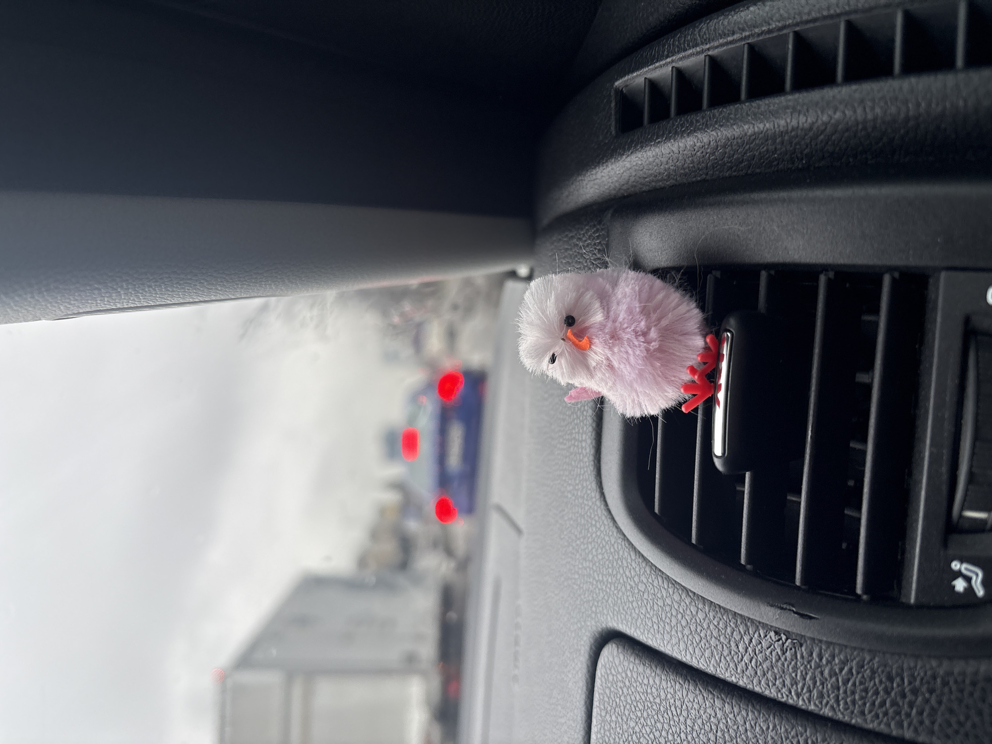 The image depicts the interior of a vehicle looking out through a rain-streaked windshield onto a road with traffic under an overcast sky. In the immediate foreground, a small, fluffy, light pink chick-shaped ornament with a white head, orange beak, and red feet is clipped onto a horizontal slat of a black plastic air vent on the passenger-side dashboard. The dashboard exhibits a textured surface. Through the windshield, a blurry traffic scene is visible. A blue sedan with illuminated red taillights is prominently featured in the mid-distance, behind which other indistinct vehicles and their lights are present. To the left, a large white truck is partially visible, also blurred. The sky appears uniformly grey, indicative of cloudy or rainy weather. No specific landmarks or signage are discernible to identify the precise location within the city of Sofia, Bulgaria; the scene depicts a generic urban traffic environment. No people are visible.