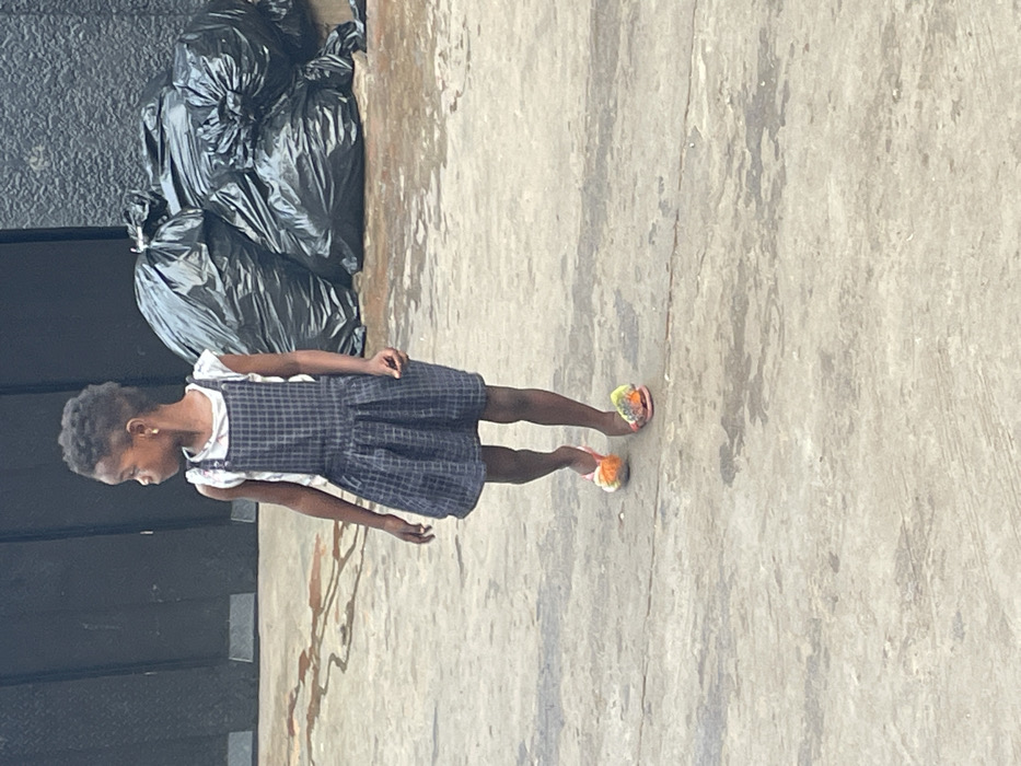 A young, dark-skinned girl in a blue plaid dress and fluffy sandals stands on a concrete surface. Three large black garbage bags are visible to the left, next to a dark, corrugated structure. The girl faces left, looking down. The concrete ground shows streaks and variations in texture and color.
