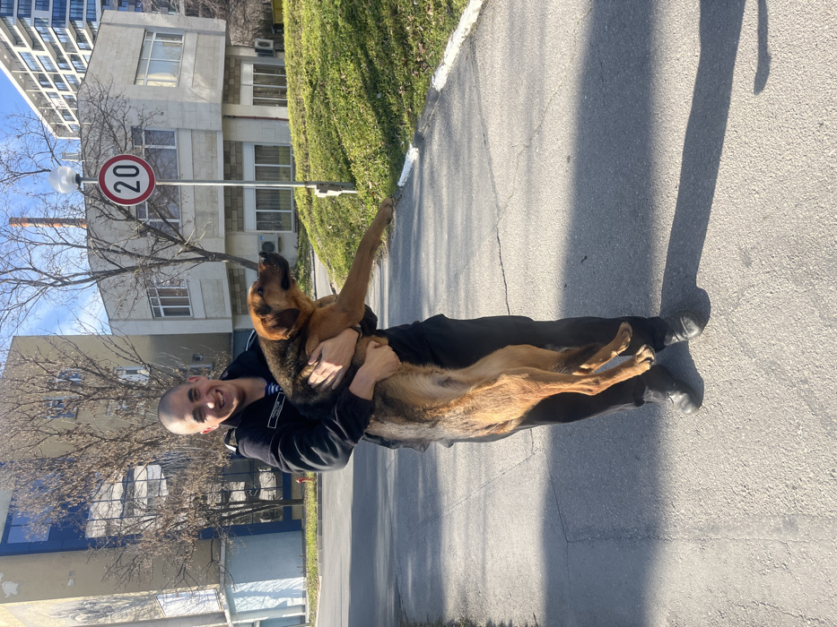 An adult male stands outdoors, holding a large dog. The man, with a shaved head, wears a dark jacket, dark trousers, and dark shoes, and smiles towards the viewer. A name patch "ЛИСИТОВ" is visible on his left shoulder area. He supports a medium-sized dog with a tan and dark brown coat, which he holds in his arms; the dog's legs hang down, and its head is turned to the right side of the frame. They are situated on a paved surface. To their right, a green grassy slope ascends slightly, with a white painted curb line. A light pole with a circular speed limit sign indicating "20" is positioned in the midground to the right of the man. The background features several buildings under a clear blue sky. On the left, a multi-story building displays a light-colored facade with a prominent blue reflective glass section and a faded mural. To the right of that, another multi-story, lighter-toned building with multiple windows is visible, with a chimney stack rising behind it. Bare deciduous trees are scattered throughout the background. In the far distance, modern high-rise buildings are discernible. This scene is located in Varna, Bulgaria, specifically in the vicinity of "Sveta Marina" University Hospital and Medical University of Varna.
