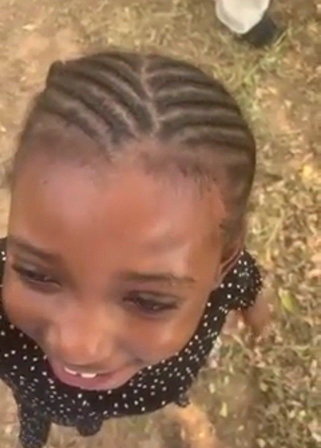 A young girl in a black polka-dot dress is looking up at the camera with a smile. She has her hair braided in neat cornrows. She then looks down and appears to fall forward onto the ground. The scene is outdoors, with ground covered in dry grass and leaves. Part of a person wearing light-colored pants and black shoes is visible in the background. Another pair of black shoes is visible near the bottom of the frame, presumably belonging to the person filming.