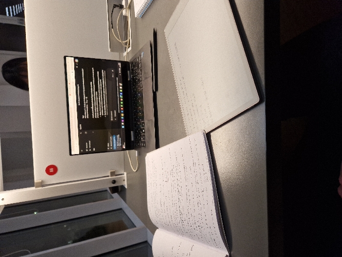 A gray desk setting includes a partially opened laptop displaying code or text, a pen or stylus lying near the keyboard, a reMarkable tablet showcasing handwriting-like text, and an open notebook filled with similar handwritten content. The setup suggests note-taking or coding in progress, possibly a combination of digital and traditional methods. The desk is plain and the lighting is dim, with a hint of an external environment reflecting on the glass panels of a nearby structure.