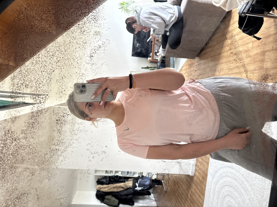 A young adult female is depicted taking a selfie in a heavily speckled and possibly distressed mirror, located within a domestic interior in Roubaix, France. She stands facing the mirror, holding a light-colored iPhone with a ribbed case in her right hand, appearing to capture her reflection. She wears a light pink short-sleeved top with a Nike logo on the left chest and grey sweatpants, with multiple bracelets on her right wrist and a ring on her left ring finger. The mirror's reflection reveals two distinct areas of the dwelling. To the viewer's left, a hallway or entryway is visible, featuring coats hanging on a rack or hooks, and a partial view of a white shelving unit. A light-colored rug with a circular pattern is on the wooden floor in this area. To the viewer's right, a living room area is reflected, where another female, with dark hair tied back, sits on a beige sofa. This second individual wears a grey hooded sweatshirt and dark leggings, looking down at a mobile phone held in her hands. A flat-screen television is positioned on a low unit in the background of the living area, alongside a potted cactus or succulent plant. The entire visible floor area consists of light-colored wooden planks.