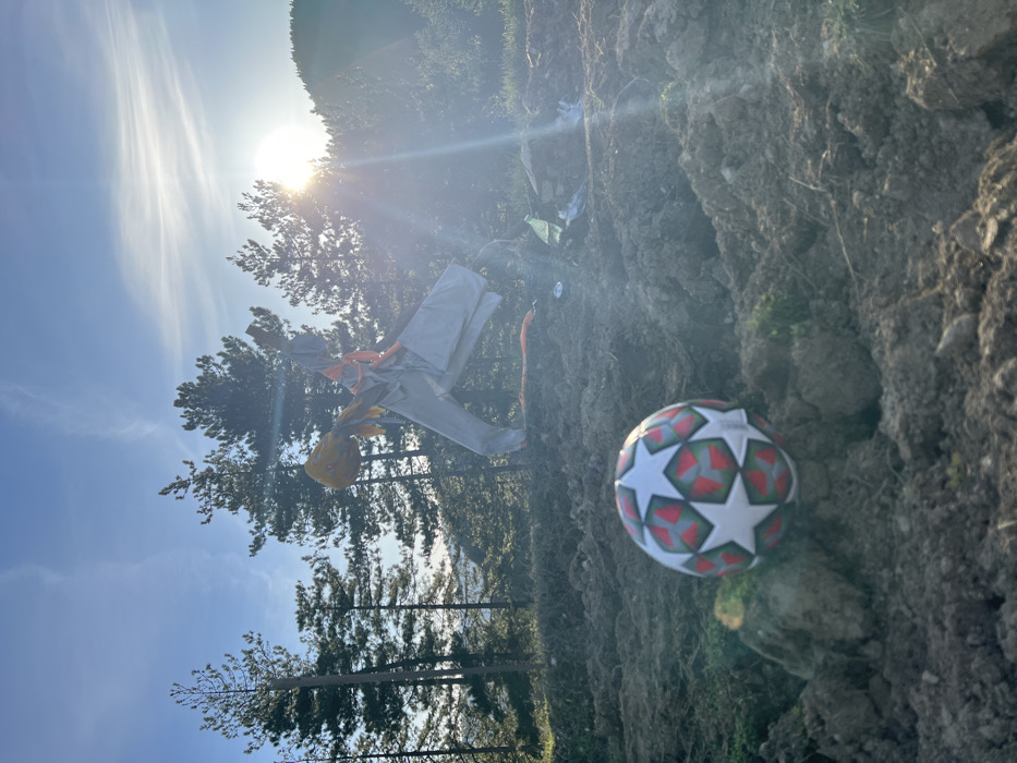 The scene depicts an outdoor, sunlit environment in the city of Nedelino, Bulgaria. The foreground consists of uneven, disturbed brown earth with scattered small patches of green vegetation. A white soccer ball, marked with a pattern of red, black, and white stars, is positioned on a small earthen mound in the lower left portion of the image. In the midground, a rudimentary scarecrow-like figure is visible. It is constructed from light-colored fabric, forming a torso and outstretched limbs, with a yellow-orange material comprising its head. An orange strap or rope is wrapped around its midsection. To the right of the scarecrow, on the disturbed ground, a light green plastic bottle and crumpled white refuse are present. The background features a dense aggregation of tall, slender coniferous trees. The sun is prominently visible on the right, high in a clear blue sky, generating a strong lens flare. Faint white wisps of clouds are discernible. A tree-covered hillside or mountain forms the distant background.