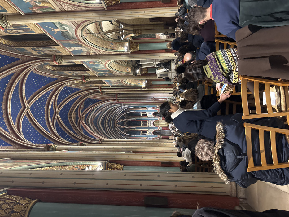 A gathering of people sits in wooden pews inside an ornate church. A woman in a dark jacket and white scarf reads from a book. The church interior features elaborate vaulted ceilings with blue and gold star patterns, paintings, and decorative columns. The image is shot from a low angle, emphasizing the height and grandeur of the architecture. Many people are seated, with only the backs of their heads visible.