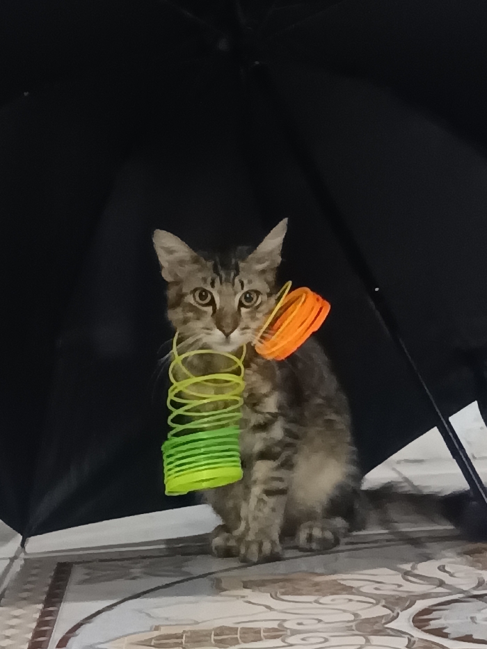 In Maleber, Indonesia, a brown and grey tabby cat with visible stripes and light-colored eyes is depicted sitting upright on a patterned tiled floor. The cat is adorned with two plastic coil toys: one neon green and yellow, positioned directly in front of its chest, and another orange one resting on its right shoulder. The background is a dark, possibly black, fabric surface, consistent with the interior of an open umbrella. The cat faces directly forward, its gaze directed towards the viewer. The floor tiles feature light brown and beige decorative patterns. No other individuals or animals are visible in the frame.