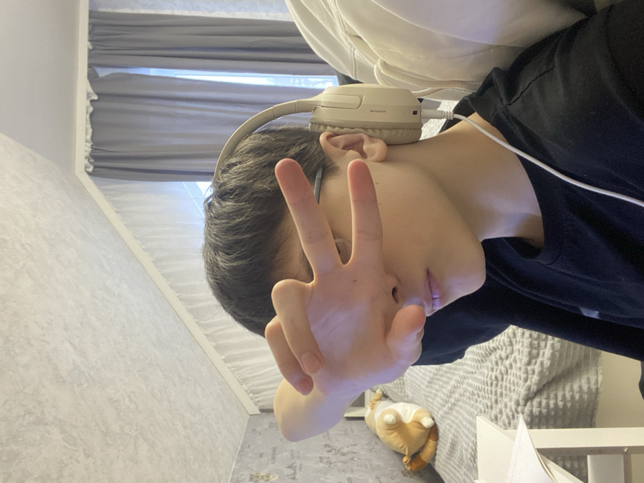The image depicts an indoor room, consistent with a bedroom or study. Visual identification of the specific city, Andreyevo, Russia, is not ascertainable from the image data. A young individual with short dark hair is positioned in the foreground, facing slightly to the right of the viewer. They are wearing a black short-sleeved t-shirt, thin-rimmed glasses, and light-colored over-ear headphones connected by a white cable visible over their right shoulder. The individual's left hand is raised in front of their face, forming a peace sign (V-sign) with the index and middle fingers extended, partially obscuring their eyes and nose. Their lips are slightly parted. In the background, to the left, a white desk surface is visible. Behind it, a bed with gray textured bedding and a light brown plush toy (resembling a cat or dog, seen from behind) rests against a wall covered with light gray patterned wallpaper. The room features a sloped ceiling, indicative of an attic space. A window with white sheer and gray opaque curtains is visible on the right side of the frame, allowing ambient light into the room. No other individuals or direct interactions are visible in the scene.