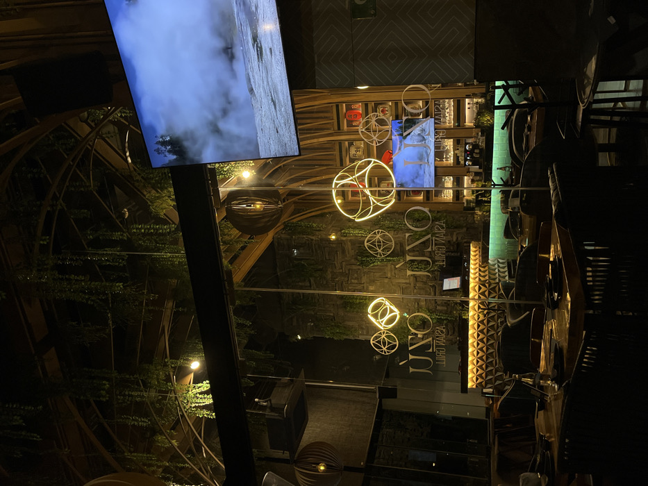 The dimly lit restaurant, Onyu Asian Grill, features modern, spherical hanging lights, a video screen, and a full bar in the background. Green plants adorn some of the walls. Tables and chairs appear in the right foreground, with a dark pole in the center of the image. The word “Onyu Asian Grill” is reflected on the glass wall.