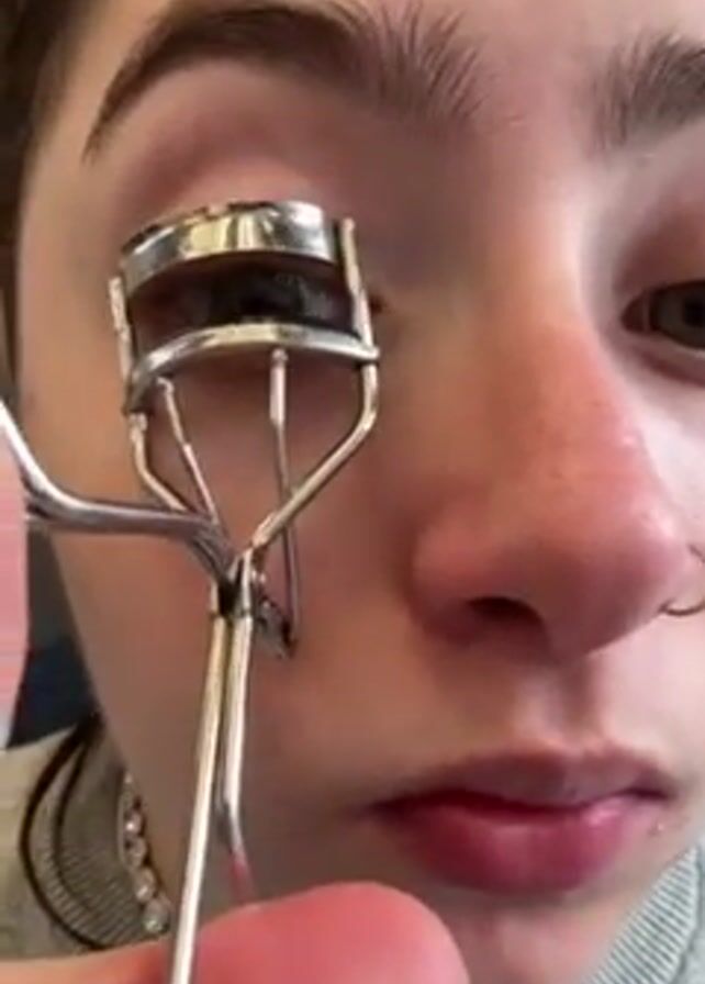 A close-up video shows a woman curling her eyelashes with a silver eyelash curler