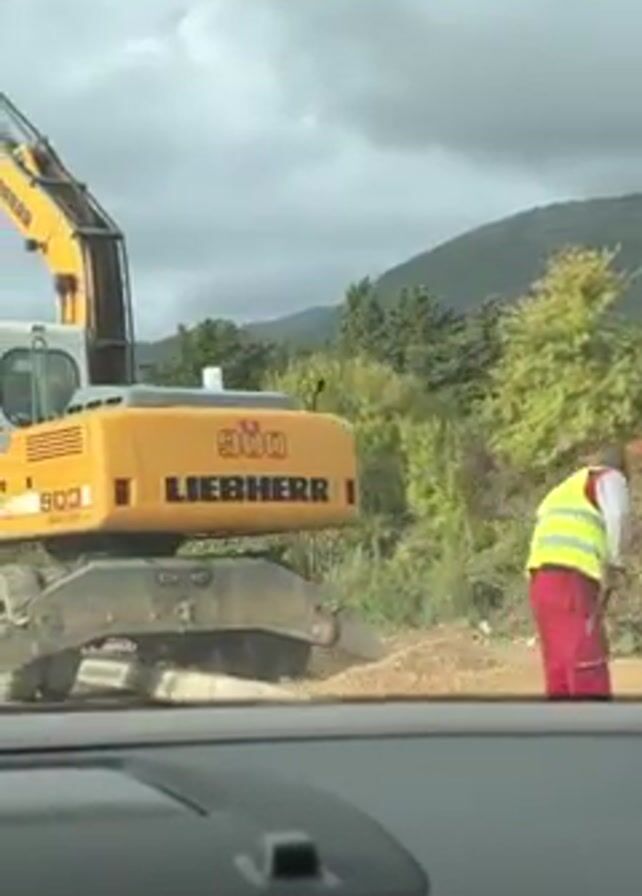 From the perspective of someone driving a car, the video shows road construction taking place. A worker in a yellow vest and red pants stands on the side of the road. A yellow and white Liebherr 900 excavator is parked nearby. A large, dirty, white dump truck passes the camera car. A red and white sign leans precariously near the side of the road. Mountains and cloudy skies are visible in the background.