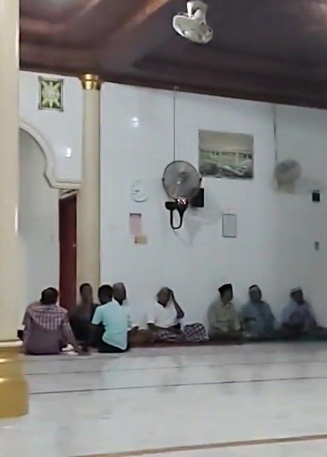 interior of a mosque. Several men are sitting on the floor. The mosque has white tiled floors and walls, with tall, cream-colored pillars with gold bases. There are arched openings in the walls leading to other parts of the mosque. A fan is mounted on the wall, and there is artwork displayed. The overall lighting is moderate.