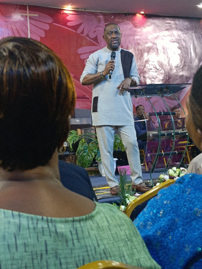 A man stands on a stage holding a microphone, dressed in a two-piece suit with a black accent piece. He appears to be speaking, with a backdrop featuring abstract designs and light effects. In the foreground, the backs of two individuals seated in the audience are visible, framing the speaker. Other individuals are seated on the stage behind the speaker. The scene seems to be taking place in a church or auditorium.