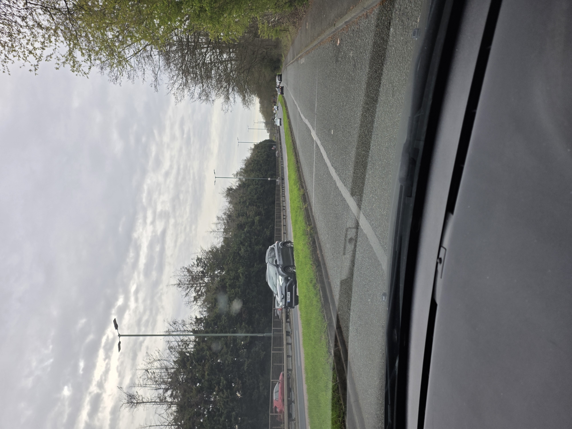 The image depicts a road scene, seemingly taken from inside a vehicle. The road is asphalt with a white dividing line. A green median strip separates the road from a parallel road or service lane. Several vehicles are visible on the road, including a grey SUV parked on the side. Trees line the side of the road. Street lights are also visible. The sky is overcast. The location is possibly on the outskirts of London, United Kingdom, based on general road design and vegetation.