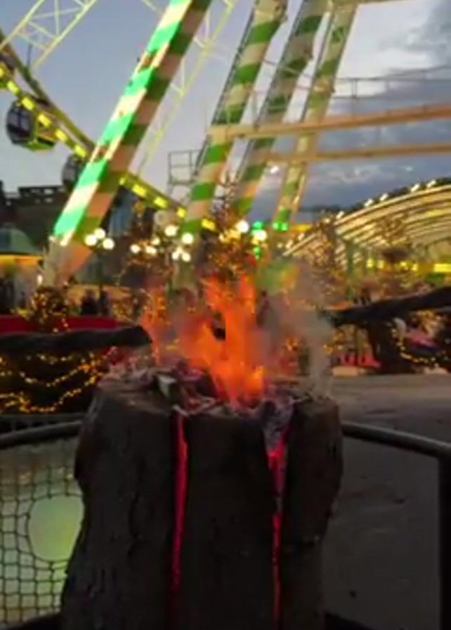 A stationary shot captures a burning log positioned in front of a Ferris wheel. The log is contained within a black metal enclosure, with bright orange flames rising from its center. The Ferris wheel is decorated with green and white stripes and illuminated cabins. In the background, there are decorated trees with warm-toned lights and blurry figures of people can be seen. The sky is overcast and the light is dim. The camera remains still throughout the video.