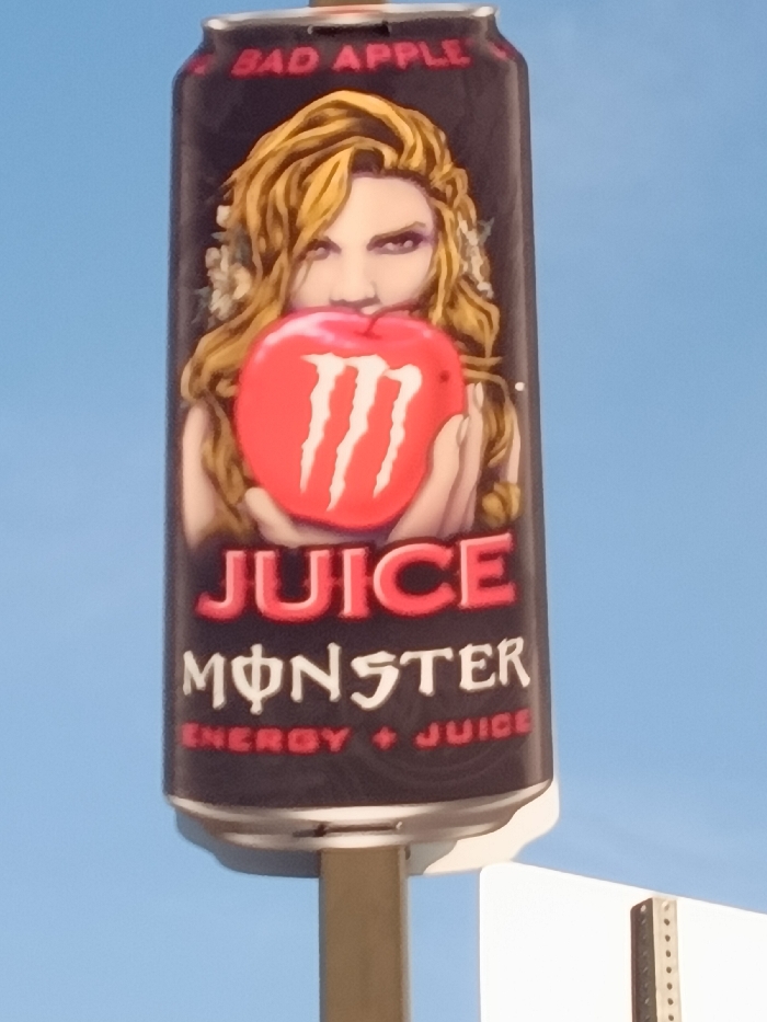 - "A large, cylindrical sign, designed to mimic an oversized "Juice Monster" energy drink can, stands vertically against a clear blue sky in Monterey Park, United States of America" by FM-7Rq8C3, licensed under CC BY 4.0