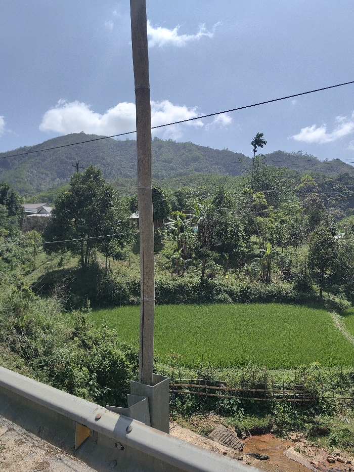 This image captures a rural landscape on a clear, sunny day, depicting a mountainous area on the outskirts of Huế, Vietnam. In the immediate foreground, a gray metal guardrail, part of a bridge or elevated roadway, runs horizontally across the bottom third of the frame. To the right, beneath the guardrail, a small stream with reddish-brown water flows over visible concrete debris. A cylindrical utility pole, appearing to be made of treated wood or bamboo with metal banding, extends vertically through the center of the image, rooted in a concrete and metal base. A thin black utility wire stretches horizontally across the frame at mid-height, passing behind the pole. The midground features a rectangular field of vibrant green crops, consistent with a rice paddy, bordered by a dense thicket of green foliage and a low, rustic bamboo fence. Beyond this cultivated area, the terrain rises, covered extensively with lush tropical vegetation, including multiple banana plants and various trees. Several small, simple buildings with light-colored roofs are visible nestled within the foliage, particularly one prominent structure on the far left. A tall, slender palm-like tree stands distinctly on the right side, rising above the surrounding tree canopy. The background is dominated by a range of verdant, tree-covered mountains under a bright blue sky dotted with scattered white cumulus clouds. No people or active subjects are present in the scene.