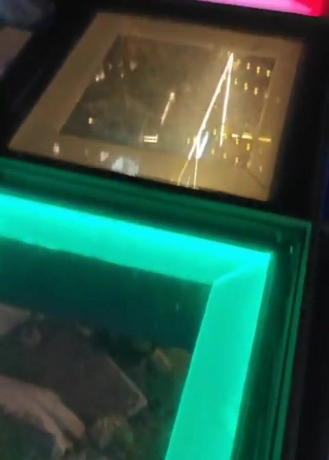 group of people standing on a bridge with a glass floor illuminated by colorful lights