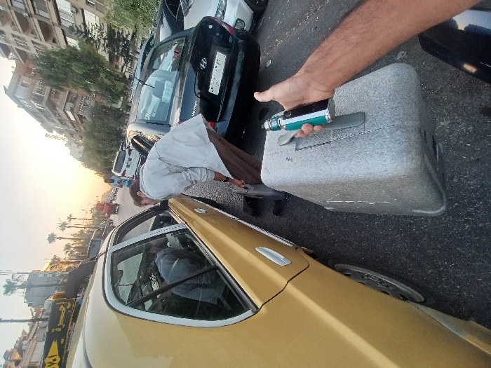 The image depicts an urban street scene in Al-Mazza Municipality, Syria, at sunset. In the immediate foreground, a human right hand holds a teal, black, and silver vape device over a rectangular, light grey textured container with a dark grey handle, resting on asphalt pavement. To the left, a golden-colored sedan, equipped with a yellow and black roof sign featuring Arabic script, is parked. Its front passenger window is open, revealing the reflection of a male subject wearing a light grey shirt inside the vehicle. Adjacent to this golden sedan, a male subject with short dark hair, wearing a light-colored jacket and dark brown pants, is bent over, facing the open window area of the golden car. Behind the golden sedan, a black Hyundai Verna sedan is parked, with its rear driver's side door open. Its license plate displays Arabic characters and numerals. Further down the street, multiple other vehicles are visible, including a white car, and a distant figure pushes a red cart. The background consists of multi-story residential or commercial buildings lining the right side of the road, interspersed with palm trees and other vegetation. The sky displays warm orange and yellow hues, indicating a sunset.