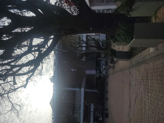 An outdoor urban scene in Bogota, Colombia, specifically identified as the area near Unicentro Bogotá, along Carrera 15 and Calle 127. The image depicts a wide-angle view under an overcast sky with direct sunlight creating a bright glare in the upper left quadrant, resulting in significant silhouetting. In the foreground, a reddish-brown brick-patterned pavement occupies the left and central portions, leading towards the background. To the right of the pavement, a narrow concrete sidewalk runs parallel, lined with multiple light gray, rectangular concrete planters each containing dense green shrubbery. A large, dark, deciduous tree with numerous bare, gnarled branches dominates the right side of the frame, extending from the bottom to the top, its trunk heavily textured and dark. In the mid-ground, a series of dark-colored, modern-style benches or seating structures are visible along the paved walkway. Further back, a light-colored commercial van or similar vehicle is partially visible. The background is dominated by a large, multi-story commercial building with a dark facade. The word "BOSS" is prominently displayed in light-colored capital letters on its upper section. The building features a distinctive, possibly sloped or canopy-like roof structure visible against the bright sky. Behind and above this building, a concrete overpass or bridge structure is discernible. No individuals are clearly visible within the scene. The overall environment suggests a well-maintained commercial or shopping district.