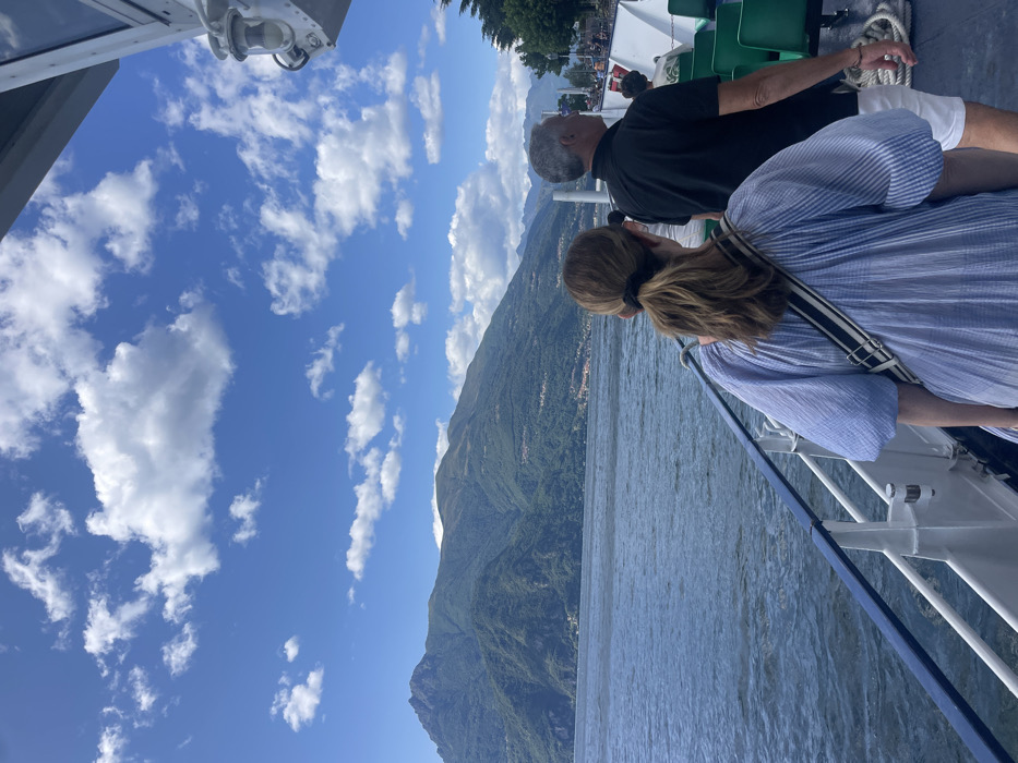 Two individuals gaze upon a scenic lake and mountain backdrop from the deck of a boat. The person in the foreground wears a blue-striped shirt with a black and white crossbody bag, while the other is dressed in black. The boat's white railing is visible, and the vast sky is filled with fluffy white clouds. The mountainous landscape features lush greenery and small settlements. The water is calm, reflecting the surrounding scenery.