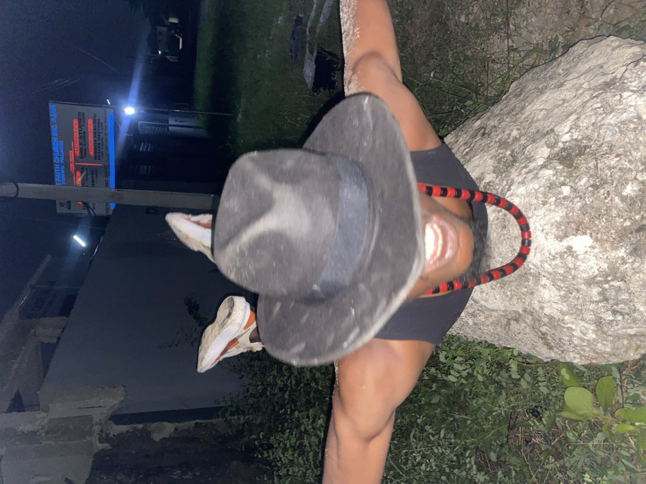 A person stands outdoors in dim lighting, wearing a cowboy hat and a red and black striped neck piece. White running shoes with orange accents are visible. A large rock is to the right of the person. In the background, a sign is illuminated, reading "VICT... FAITH CHURCH INC. AJAH (KING'S PALACE)...MONDAY...BRILE STUDIOS...MIRACLE HEALING." A street light and a building are also visible in the background.