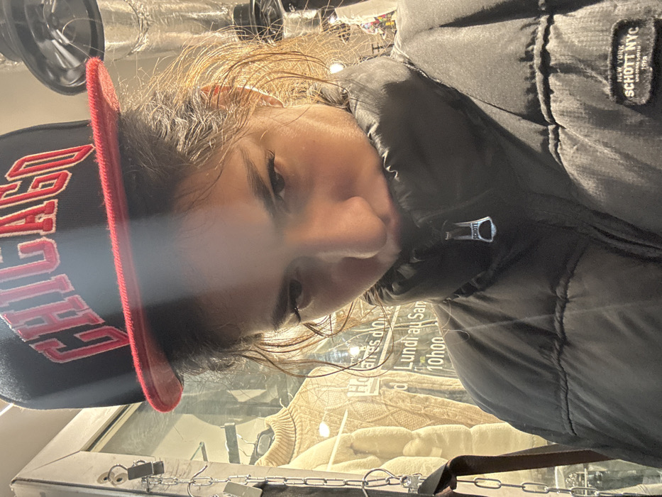 A female individual is depicted in a close-up portrait, looking directly at the viewer with an intense gaze, her head tilted slightly downwards. She wears a black baseball cap with a red brim, featuring the word "CHICAGO" in prominent red lettering on the front. Her dark hair appears loosely styled and slightly disheveled. She is dressed in a black puffer jacket with the collar pulled up, obscuring her chin and mouth. A metallic zipper pull with "SCHOTT" embossed on it is visible, as is a black patch on the lower right side of the jacket bearing "NEW YORK SCHOTT NYC ESTOWN NORTH 1913" in white text. The background reveals a display window of a retail clothing establishment. Through the glass, a light-colored, possibly cream or beige, cable-knit sweater is displayed on a mannequin. French text is visible on the window, stating "Horaires d'Ouverture" (Opening Hours), followed by "Lundi au Sam" (Monday to Saturday), and "10h00" (10:00). To the left, a metal chain display with hooks hangs, from which a dark strap or object is suspended. In the upper right background, a metallic, ribbed cylindrical object, possibly a ventilation duct or light fixture, is partially visible. The scene is situated in a retail clothing establishment in Strasbourg, France, as indicated by the visible French text on the display window.