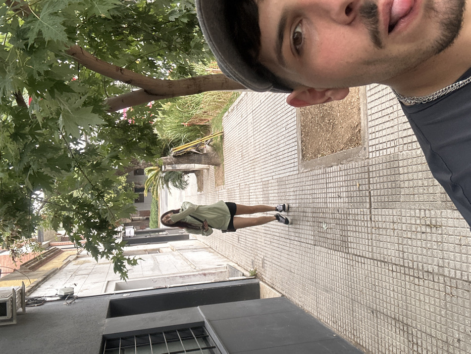 An outdoor street scene in a city setting, typical of Buenos Aires, Argentina. The image is a selfie taken by a male subject partially visible in the bottom right foreground, showing only his right eye, nose, mouth, and part of his head and torso. He has a dark mustache, his tongue is slightly extended, and he wears a dark flat cap, a dark t-shirt, and a silver chain necklace. In the midground, a female subject walks away from the camera on a tiled sidewalk, looking back towards the camera. She has long dark hair and wears a light green long-sleeved top, black shorts, and dark sneakers. She carries a black cross-body bag and holds a smartphone in her left hand, while her right hand is raised in a gesture, possibly a wave. The environment includes a grey tiled sidewalk extending into the distance. To the right of the sidewalk, a narrow strip of exposed earth with sparse mulch is visible, bordered by a large tree with green foliage, tall green grasses, and other smaller plants. A yellow object, possibly a ladder or barrier, rests against a tree trunk. To the left, a light-colored building with dark window frames and an exterior air conditioning unit forms the immediate background, followed by an older, possibly brick building further down the street. Overhead, large green tree canopies partially obscure the sky.