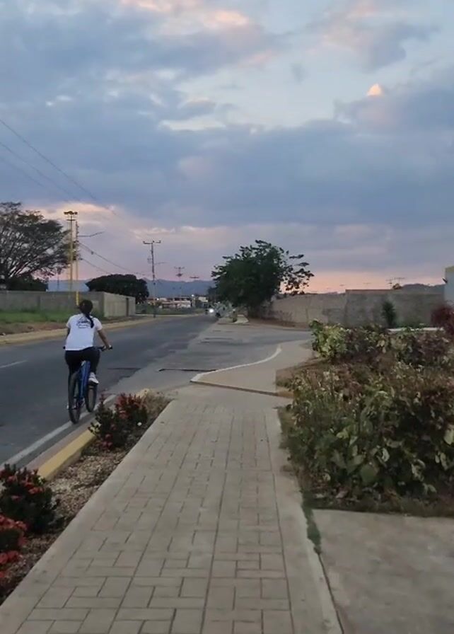 A person on a blue bicycle rides along a sidewalk, moving away from the camera. The sidewalk is made of gray pavers and is lined with small red flowers and bushes. Adjacent to the sidewalk is a road with yellow lines along its edge. A motorcycle is parked on the road. In the background, there is a tree, power lines, and buildings. The sky is partially cloudy with shades of blue and pink.