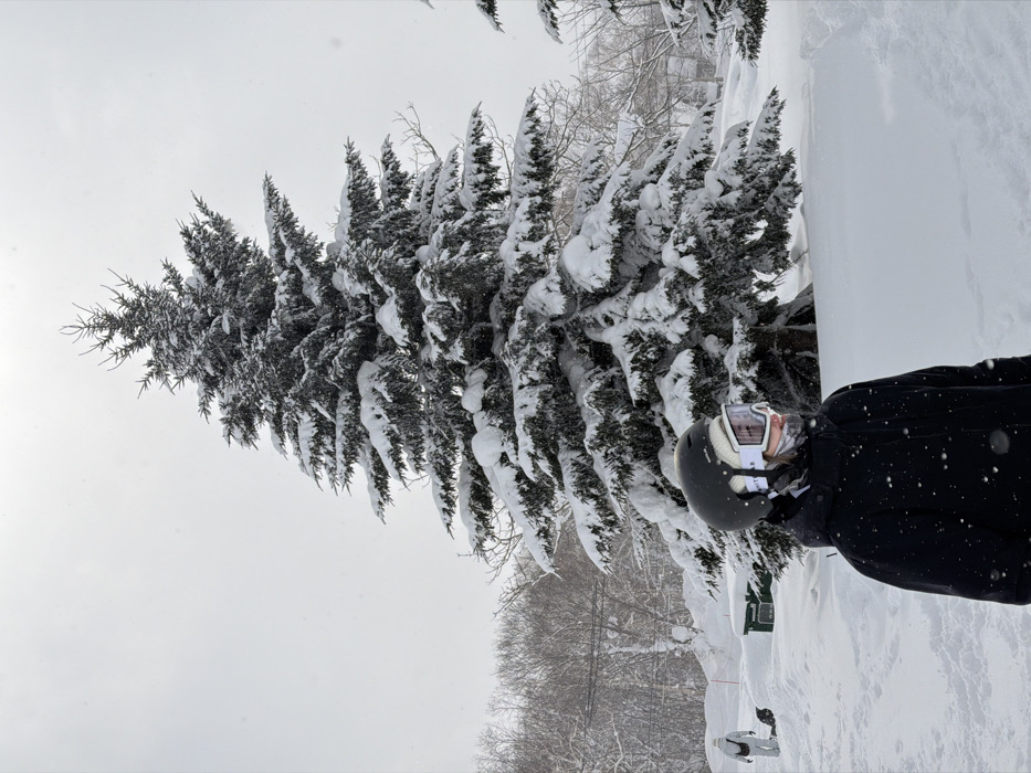 A skier stands on a snowy slope, adjacent to a snow-laden evergreen tree. The skier wears a black jacket, helmet, and goggles. Heavy snowfall covers the tree's branches, creating a dense, picturesque winter scene. Bare trees are visible in the background. The sky appears overcast, contributing to the snowy atmosphere.