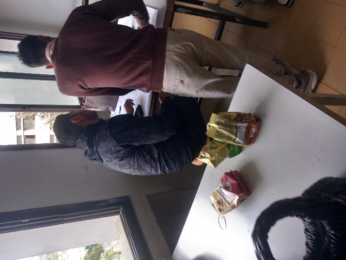 The image depicts an indoor scene within the Al-Qanawat Municipality, Syria. Two adult males are present in what appears to be an office or classroom environment. One male is seated on the left, partially facing away from the camera, wearing a dark camouflage-patterned hooded jacket. He is looking towards the right side of the frame, seemingly at the activities of the second male. The second male is standing on the right, facing away from the camera, dressed in a brown long-sleeved sweater over a light collared shirt and light beige trousers. He is leaning over a dark-framed table or desk, where white papers or documents are visible. His hands are positioned over these items, suggesting an interaction or examination. In the foreground, a white table displays a black object, possibly a handbag, and three upright, partially opened snack bags in red, green, and orange/yellow packaging. A large window on the left side of the room reveals an exterior view of multi-story buildings and sparse vegetation under natural daylight. The room features light-colored walls and a light-colored tiled floor.