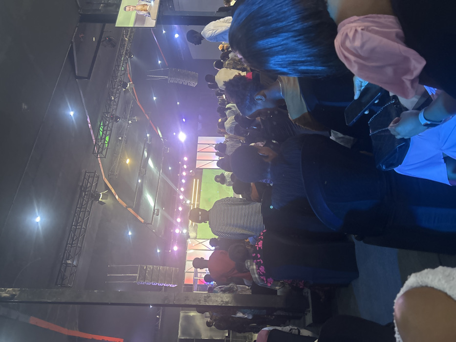 The image depicts an indoor event taking place within a large venue in Jos, Nigeria. The environment is characterized by a high, dark ceiling fitted with exposed metal trusses, from which numerous stage lights emit purple, blue, green, and white illumination. Two line array speaker systems are suspended from the trusses, one visible on the left and another on the right side of the stage area. The stage features a prominent central screen displaying abstract graphics, predominantly green with white and orange vertical elements. An additional, smaller monitor is visible on the far right, showcasing a person speaking. A sizable audience, consisting mainly of young adults and adults, is gathered, predominantly seated in black event chairs. Several individuals are standing in the aisles or at the rear of the seating area. In the immediate foreground, positioned with their back to the viewer, is an individual with dark, straight hair, wearing a black top with a puffy pink sleeve. This individual is holding a black handbag with a chain strap and actively using a smartphone. A white wristband is visible on their left wrist. To their immediate left, another individual, seen from behind, has dark, curly hair and is wearing a brown and tan top. Further into the crowd, a person is observed wearing a black top with pink floral patterns. Two distinct standing individuals, both facing the stage, are visible: one in a white and black horizontally striped long-sleeved shirt and another in a red t-shirt. The collective orientation of the audience towards the stage indicates their attendance at a presented event.