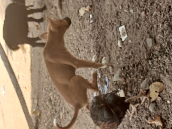 The scene, located in Zango-ndaji, Nigeria, captures three animals on unpaved, debris-strewn ground. In the immediate foreground, a dark-feathered chicken with reddish-brown tones is visible from the rear, its head lowered towards the ground, indicative of foraging. Centrally positioned, a light brown dog with distinctive white paws adopts a low, squatting posture, its tail curled over its back, and its head angled downwards towards the ground. In the blurred background, a dark-colored quadruped animal, consistent with a goat or sheep, stands facing right. The ground comprises reddish-brown dirt, small stones, and scattered light-colored fragments and dried leaves. The outdoor setting is illuminated by natural daylight.