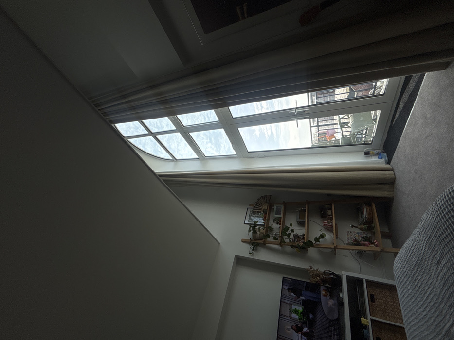 The image depicts an interior apartment room located in Bristol, United Kingdom. The foreground shows a grey textured throw covering a surface, and light grey carpet on the floor. To the left, a white media console holds a television displaying an indoor scene featuring multiple individuals. Below the television, two light-brown woven baskets are stored in cubby holes, and a dark vase containing dried botanicals rests on the console top. Adjacent to the console, a wooden ladder-style shelving unit stands against a light-colored wall, displaying potted plants, framed photographs, and a decorative fan. The room's right side is dominated by a tall, white-framed arched window with integrated glass doors, flanked by light-colored, floor-to-ceiling curtains. The doors open to a balcony secured by a dark metal railing. Visible on the balcony are a partially obscured light green folding chair, a small orange bucket, and a white bottle. The exterior view from the balcony reveals an urban landscape under a cloudy sky. Strong natural light enters the room through this window, creating areas of shadow within the interior. The ceiling of the room is angled, ascending towards the tall window structure. No human subjects are visible within the immediate room.