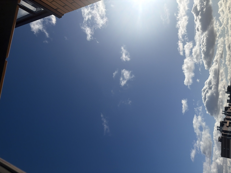 The scene, located in Novosaratovka, Russia, presents an upward-angled exterior view dominated by a bright blue sky. A strong sun flare is present in the upper right quadrant, indicating direct sunlight. Sparse, white cirrus clouds are visible in the upper and mid-sky, while a denser formation of white cumulus clouds occupies the lower third of the sky. The top left and top center edges are framed by a dark, indeterminate architectural overhang. The upper right corner features the light brown brick facade and dark-framed window of a building. Along the bottom, the dark rooftops of multiple multi-story buildings are visible, characterized by flat designs, parapet walls, and numerous ventilation structures. No people, animals, or vehicles are present; the scene is static.