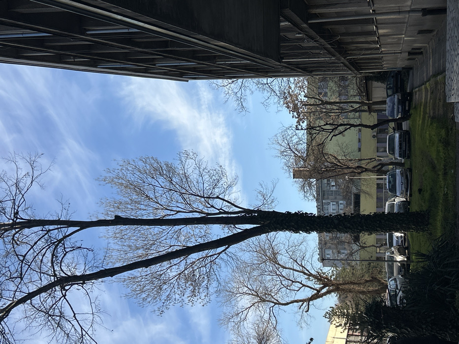 The image displays an urban outdoor scene in Plovdiv, Bulgaria, under a clear, light blue sky with wispy white cirrus clouds. A large, bare deciduous tree, its lower trunk covered in dark green ivy, stands prominently in the left-center foreground, splitting into two main trunks. To its immediate right, a multi-story building with a grey, brutalist-style facade, characterized by horizontal concrete bands and recessed windows, occupies the entire right side of the frame. In the midground, beyond a patch of green grass, a paved parking area is visible, containing approximately eight parked passenger vehicles of various models and colors, including silver, white, and dark shades. A street light pole is positioned among the trees and cars in this area. Behind the parking lot and further deciduous trees, a pale green building is visible, partially obscured. Above this green structure and the surrounding trees, a large, grey, multi-story residential building with numerous windows extends across the background. Additional bare deciduous trees are scattered throughout the midground and background, indicating a season devoid of foliage. No individuals are present in the scene.