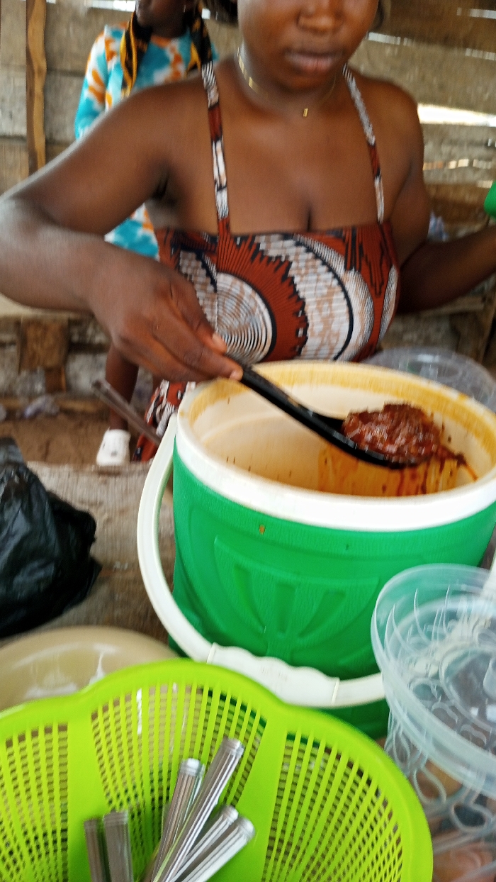 An image taken in Zango-ndaji, Nigeria, depicts an indoor, open-stall food service scene. The primary subject is a dark-skinned woman, positioned center-right, wearing a sleeveless, square-neck top with brown, white, and red circular patterns. She also wears a thin gold-colored choker necklace. Her right hand, holding a black serving spoon, is actively scooping a reddish-brown, textured food substance from a large, green and white insulated container (cooler). The cooler appears to contain a base of lighter-colored food (possibly rice) beneath the scooped substance. To the left foreground, a bright lime-green plastic colander holds several slender, cylindrical metal utensils or small cups. Adjacent to the colander on the right, a clear plastic container with a textured lid is visible. A crumpled black plastic bag rests on a light-colored, shallow bowl in the far left foreground. In the background, partially obscured by the main subject, another individual is visible wearing a light blue and orange/yellow tie-dye patterned garment. The environment consists of wooden plank walls in the background and an earthen or sandy floor, where a single white child's shoe is also visible.