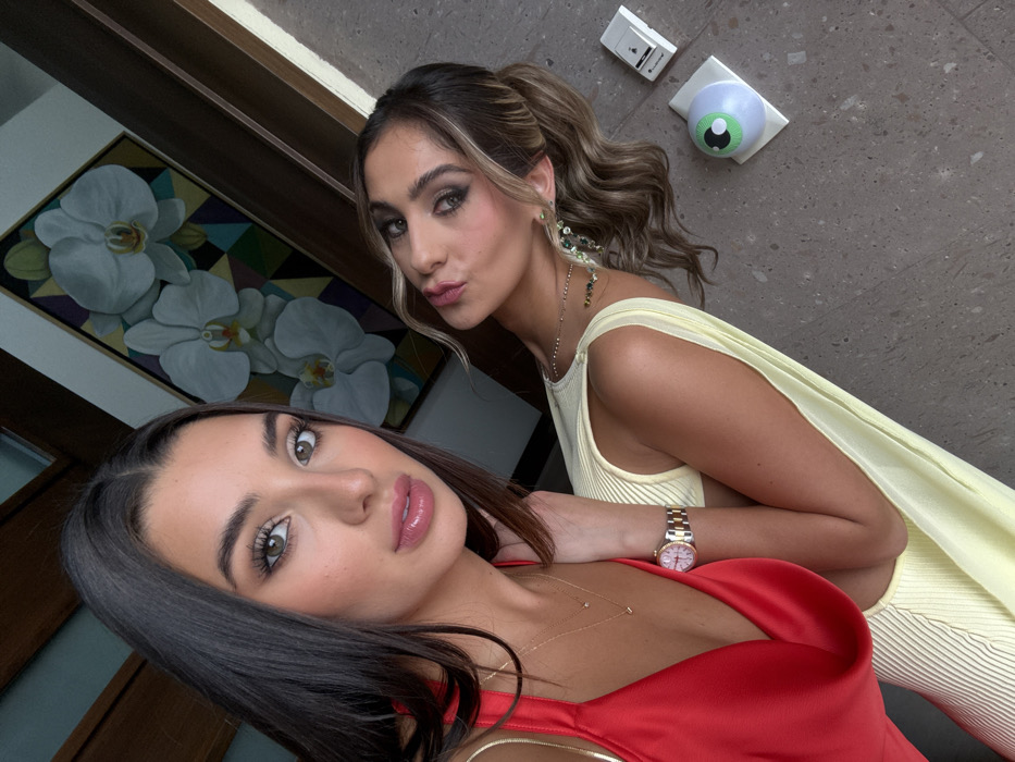 The scene is located indoors in Monterrey, Mexico, depicting two young adult females. Female 1, positioned on the left and closer to the camera, has long, dark brown hair parted centrally. She wears a red, sleeveless top with a draped neckline and a delicate gold-toned necklace featuring two small heart-shaped pendants. A rose gold watch is present on her left wrist. She has light green eyes and pink lip gloss, looking directly at the camera with a neutral expression. Female 2, positioned to the right, has light brown/blonde highlighted hair styled in a ponytail. She wears a light yellow, ribbed, sleeveless top, a gold-toned beaded necklace, and multi-tiered green-toned drop earrings. Her eye makeup is dark, and she pouts towards the camera. The background features a wall with a vertical rectangular painting depicting three white orchids with light green centers against a geometric pattern in shades of blue, green, and brown. A dark brown architectural element, likely a doorframe or column, is visible on the far right. The floor consists of large, light gray/brown textured tiles. On the floor to the right, a white rectangular object (possibly a remote control) with black markings and a novelty item resembling an eyeball with a green iris and black pupil, resting on a white square base, are present. Both individuals are posing for a photograph.