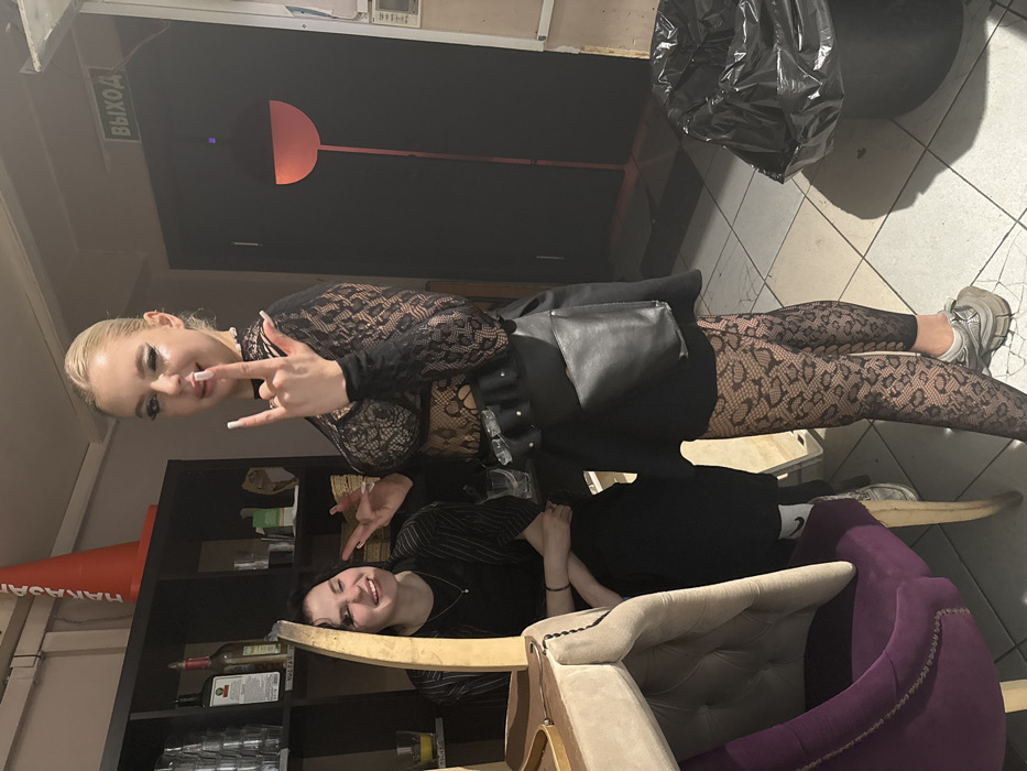 Two women pose indoors. The blonde woman in front wears a black lace top and leggings, a black skirt, and gray sneakers. She gestures with her hands. Behind her, a brunette sits on a chair, smiling and making a peace sign. A dark shelf is visible behind them with various items. Above them is a black door with a red accent. The floor is tiled. A black garbage bag is visible in the background.