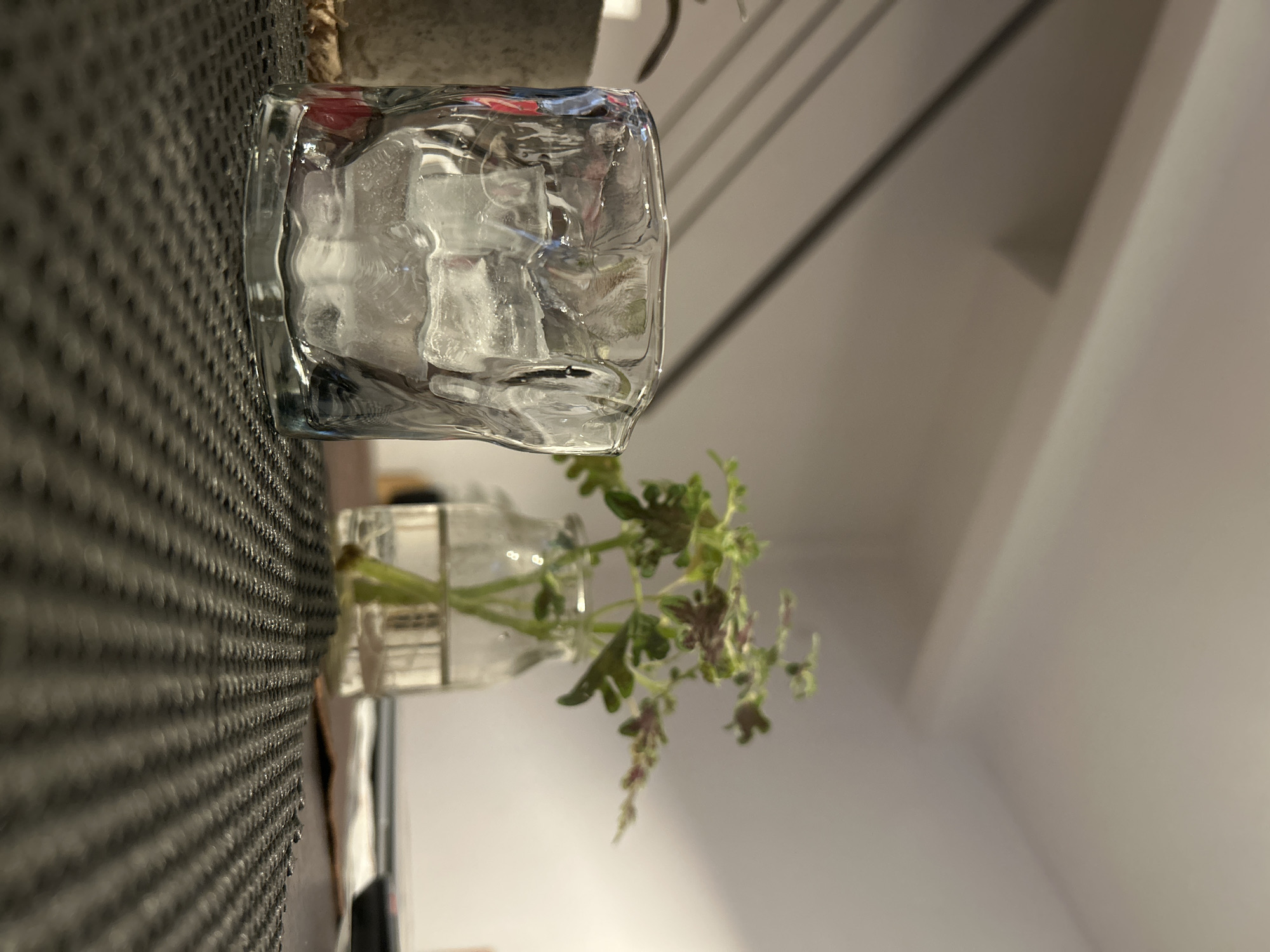 The scene, located indoors in Villa San Andrés, Argentina, features a clear glass tumbler filled with multiple irregular ice cubes, positioned on a dark, textured, possibly woven placemat with a repeating raised dot pattern. The tumbler exhibits an uneven, undulating upper rim and textured glass sides. To the immediate left, a segment of a light gray cylindrical pot is partially visible. Further back and to the right, a clear glass bottle contains water and a plant cutting with multiple stems and green and reddish-purple leaves. The background consists of a light-colored wall, with blurred diagonal lines in the upper left quadrant consistent with a staircase railing or similar architectural element. No individuals are present. The environment appears to be an interior space under artificial illumination.