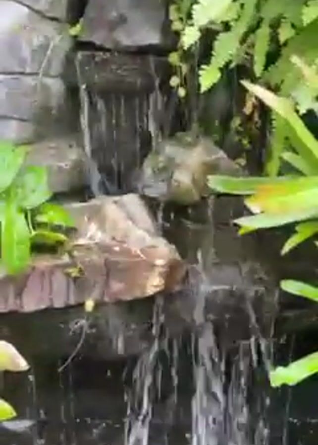 The video displays a small, artificial waterfall cascading down a rock structure into a dark pond