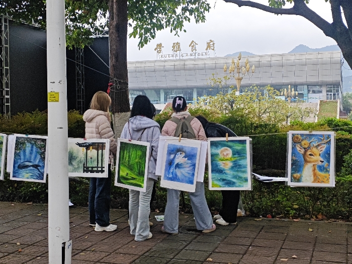 The image displays an outdoor art exhibition on a paved walkway in the Chongqing High-tech Zone, China