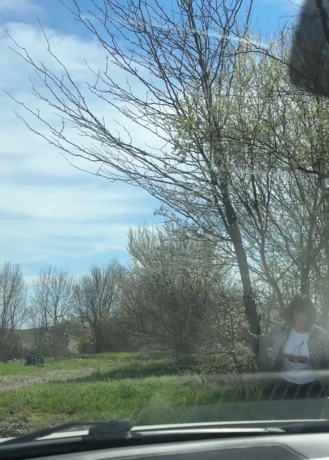 view from the inside of a car. The camera faces a dirt road with grass on the sides. Trees with bare branches and some blooming white flowers are visible along the roadside. A woman wearing a white shirt, a gray and white jacket, and glasses is standing near the trees. She appears to be gesturing or speaking. The sky is blue with scattered white clouds. The car's dashboard is visible in the foreground. The woman moves out of frame.