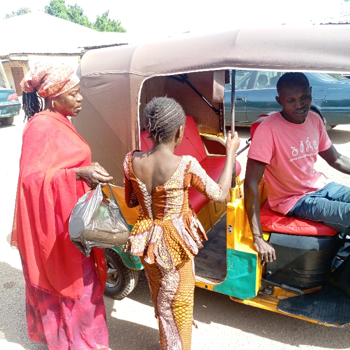 This image depicts an outdoor scene in Jos, Nigeria, featuring three individuals and a motorized tricycle, typically known as a Keke Napep. On the left, an adult female with dark skin and dreadlocks, covered by a patterned red headwrap, stands facing towards the right. She wears a flowing red gown and holds a black plastic bag containing a silver-colored object in her left hand. Henna-like patterns are visible on her left hand. In the center, a young female, seen from behind, is partially entering or interacting with the passenger compartment of the tricycle. She has dark skin and braided hair styled back. She wears a fitted, patterned dress in shades of orange, brown, and cream, featuring a peplum waist and a V-neck cut at the back. Her right hand is on the tricycle's interior frame. On the right, a young adult male with dark skin sits in the driver's seat of the tricycle. He wears a light pink t-shirt with white graphic designs and blue jeans. He looks towards the left with a slight smile. His right hand is near the tricycle's controls. A thin band is visible on his left wrist. The tricycle features a brown canopy, yellow and green body accents on the lower passenger section, and red upholstered seats. It appears to be a typical three-wheeled auto-rickshaw used for transport. The scene takes place on a paved surface. In the background, a light-colored building is visible on the left, along with parts of at least two parked dark-colored sedan vehicles. The lighting is bright, indicative of daylight under a clear sky.